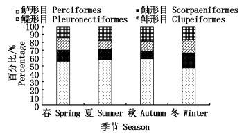 不同季节调查所获得的渔获物各有不同(表 1)。其中可以发现,夏季所获的种类最多,冬季最少,其中四季共有种为30种,分布在7目20科27属中。选取种类最多的4个目,对其不同季节的分布进行分析。结果发现,鲈形目的种类除了冬季外,在其他3个季节所占的比例均超过了50%,其中秋季最多,为24种,冬季最少,为15种;鲱形目种类在夏秋季均占当季种类的14%,春季最少,占12%;鲉形目和鲽形目鱼类所占比例相对较低,都在7%~15%的范围之内。Kruskal-Wallis秩和检验比较结果可以看出,各个季节的种类分布情况存在显著差异(χ2=33.966,P<0.01)。