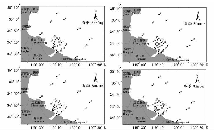 海州湾海域位于黄海南部, 属典型的开放型海湾, 具有明显季风气候特点。湾内海流受到多条近海海流的影响[1-2],因此该海域内水质优良,具有丰富的生物资源和较高的生产力,曾是中国著名的八大渔场之一,也是国家重点扩建的海洋渔港之一[3-4]。然而近年来的掠夺式捕捞和环境污染对许多鱼类的栖息地造成了严重的破坏, 因此海州湾的渔业资源衰退日益严重[5]。目前国内已有多所科研机构开展了针对海州湾的渔业资源调查,并且取得了较好的成果[6-7]。而最近针对于海州湾的调查也在2011年[8],近年来针对海州湾渔业资源的关注度也在不断提升,随着环境的变化,渔业资源也会受到较大的影响。因此,该海域渔业资源的跟踪监测是深入了解鱼类的种类组成、密度分布等基本群落生态特征的重要内容,将为渔业资源的持续开发和管理提供科学依据。