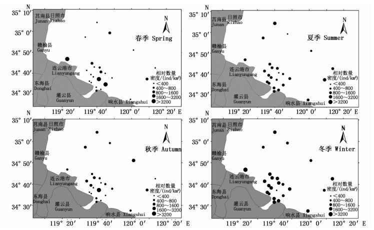 2.3 相对资源密度的时空分布差异对海州湾南部海域的相对资源密度估算结果认为,4个季节鱼类的质量相对资源密度分别为:春季(14.16±3.23) kg/km2,夏季(12.15±2.67) kg/km2,秋季(8.75±1.59) kg/km2,冬季(9.42±2.73) kg/km2;对应的尾数相对资源密度分别为:春季(1 122.71±235.43) ind/km2,夏季(1 053.94±306.78) ind/km2,秋季(935.94±147.15) ind/km2,冬季(1 936.45±287.89) ind/km2;季节分布上来看,除了冬季以外,质量相对资源密度和尾数相对密度的变化有着较高的一致性。Kruskal-Wallis秩和检验分析认为,各个季节质量相对资源密度不存在显著差异(χ2=7.225,P>0.05),而尾数相对密度则存在显著差异(χ2=12.931,P<0.05)。