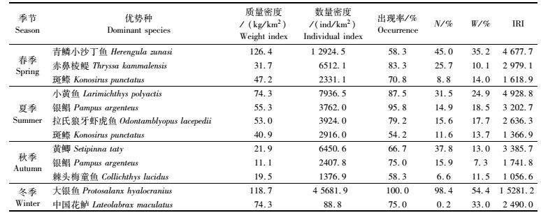 4个不同季节航次的调查结果显示,每个季节的优势种均不超过4种,且各季节优势种有部分重叠,也有所不同,有较明显的季节更替现象。春、夏季均出现了斑鰶(Konosirus punctatus),而夏、秋季均出现了银鲳(Pampus argenteus)。夏季的优势种类最多,为4种,除了斑鰶和银鲳外,还有小黄鱼(Larimichthys polyactis)和拉氏狼牙虾虎鱼(Odontamblyopus lacepedii);其次为春季和秋季,春季除了斑鰶外,还有青鳞小沙丁鱼(Herengula zunasi)和赤鼻棱鳀(Thryssa kammalensis),秋季除了银鲳,还有黄鲫(Setipinna taty)和棘头梅童鱼(Collichthys lucidus);冬季的优势种最少,仅有两种,为大银鱼(Protosalanx hyalocranius)和中国花鲈(Lateolabrax maculatus)。而冬季出现优势种大银鱼的IRI指数最高,为15 281.17,在该季节的所有站点均有所捕获,夏季的银鲳出现率也高达95.83%;春季出现的青鳞小沙丁鱼的数量密度高达12 924.51 ind/km2,捕获量非常高。