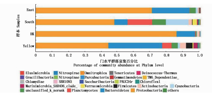 2 结果 2.1 物种组成统计分析发现压载黄海远岸、南海远岸、东海远岸和香港(南海近岸)4个域海水的压载水样品细菌序列信息归类于27门、61纲、138目、249科、481属和836种。其中黄海远岸的压载水样检测到的物种数最多,达到564种;东海远岸的压载水样物种数最少,只有406种。南海远岸的压载水样检测到的物种数和南海近岸香港海域的压载水样微生物物种数差异不大,分别为433种和442种,香港海域压载水样检测到的物种比南海远岸压载水样少一个门类,为黏胶球形菌门(Lentisphaerae)。将各海域船舶压载水样品细菌群落以门为单元进行元素集合重叠分析(图 2),共有的门类有17种分别占70.83%、70.83%、89.47%和73.91%,所占比例较高,说明各海域压载水细菌群落结构总体相似。共有门类分别是变形菌门(Proteobacteria)、拟杆菌门(Bacteroidetes)、蓝细菌门(Cyanobacteria)、放线菌门(Actinobacteria)、厚壁菌门(Firmicutes),Marinimicrobia_SAR406_clade_、浮霉菌门(Planctomycetes)、疣微菌门(Verrucomicrobia)、芽单胞菌门(Gemmatimonadetes)、绿弯菌门(Chloroflexi)、PAUC34f、SBR1093、Nitrospinae、Gracilibacteria、衣原体(Chlamydiae)和硝化螺旋菌门(Nitrospirae),还有一种OTU序列在进行BLAST比对后没有得到确切的分类学信息。黄海远岸压载水样品独有门为Saccharibacteria;南海远岸压载水样品独有的物种为螺旋体门(Spirochaetes);东海远岸和香港压载水样中无独有的门类;Gracilibacteria这一门只在远岸压载水样品中出现,在香港海域压载水样品中没有检测到。