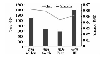 2.3 多样性指数图黄海远岸海域压载水样品细菌丰度最高(图 2),东海远岸海域压载水样品细菌丰度最低,物种丰度趋势为黄海>南海>香港>东海;南海近岸海域压载水样品细菌群落多样性最低,东海远岸海域压载水样品细菌群落多样性最高。物种多样性趋势为东海>南海>黄海>香港。即黄海远岸压载水细菌丰度最高,但多样性低;东海远岸压载水细菌丰度最低但物种多样性最高。