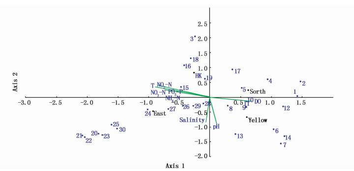 2.4 群落多样性与环境因子相关性分析结合同时期环境因子,对各海域压载水细菌群落与环境因子数据进行典范对应分析(图 3),不同数字代表不同属的物种。其中选取4个海域样点8项环境因子和相对丰度排序前30的物种进行典范对应分析。排序图中,前两个排序轴的特征值分别是0.419和0.345,结果显示各环境因子对物种的分布均有不同程度的影响,8个环境因子中溶解氧含量与第一排序轴成最大正相关0.684,温度与第一排序轴成最大负相关-0.926,营养因子与第一序轴成较强的负相关性,盐度(-0.062)和pH(0.114)与第一排序轴相关性较弱。黄海远岸压载水样点及其优势属Salinimicrobium(NO.7)同水化因子溶解氧、pH呈正相关性,温度、营养盐呈负相关性;南海远岸压载水样点及其优势属浮霉状菌属(NO.1 Planctomyces)、原绿球藻属(NO.2 Prochlorococcus)同溶解氧呈正相关性,温度、营养盐呈负相关性;东海远岸压载水样及其优势属α变形菌淀杆菌属(NO.22 Amylibacter)同温度、营养盐、盐度呈正相关性,溶解氧、pH呈负相关性;香港压载水样及其优势属γ变形细菌NO.18 Idiomarina同温度、营养盐呈正相关性,盐度、pH呈负相关性。在各海域广泛分布的假交替单胞菌属(NO.16 Pseudoalteromonas)同温度、营养盐有一定的正相关性,同盐度、pH有较强的负相关性。NO.13弧菌属同pH、盐度、溶解氧有较强的正相关性,与温度、营养盐呈负相关性; 在各海域压载水样中分布比较广泛的盐单胞菌(NO.8 Halomonas)同溶解氧、pH、盐度呈正相关性,与营养盐、温度有较强的负相关性。