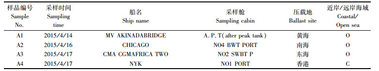 1 材料与方法 1.1 样品采集2015年春季(4月),采集4艘入境国际船舶压载水样品,编号为A1-A4(表 1)。现场使用YSI85-25便携式水质分析仪测定压载水样品的水化信息(水温、盐度、溶解氧和pH)并记录,用重氮-偶氮法、次溴酸钠氧化法、锌镉还原法和磷姆蓝分光光度法分别测定亚硝酸盐、氨氮、硝酸盐和磷酸盐。用灭菌过的蓝口玻璃瓶采集压载水样品,放置于冰盒中,在2 h内低温运送回上海海洋大学船舶压载水检测实验室。