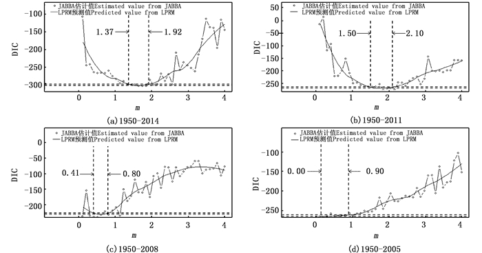 2 结果当使用1950—2014年或1950—2011年数据,且m在1.37至1.92或1.50至2.10时,模型能获得相对较小的DIC(图 1)。但当使用1950—2008年或1950—2005年数据时,要使模型获得相对较小的DIC,m的取值应小于1.0 (图 1)。因此,在使用不同时段数据时,为使模型取得相对较小的DIC,m的取值范围存在较大差异。