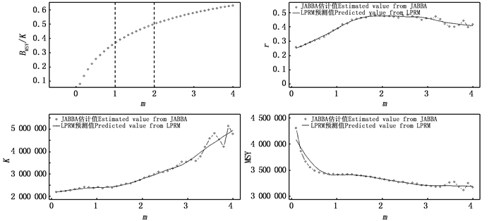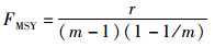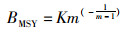 Pella-Tomlinson模型的MSY及在MSY下的生物量(BMSY)、捕捞死亡系数(FMSY)与r、m、K有如下关系: