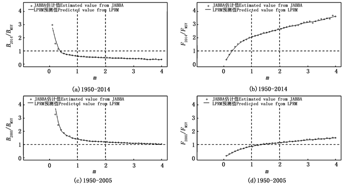 由图 3可知, 当使用1950—2014年数据时,m小于0.41时,最后1年(2014年)的生物量(即B2014)与BMSY的比值随m的增加而大幅减少,但当m大于0.41时,该比值随m的增加而减少的幅度变得相对平缓;最后1年的捕捞死亡系数(即F2014)与FMSY的比值随m的增加而增加,当m小于0.72时,F2014与FMSY的比值增加幅度较大,但当m大于0.72时,该比值的增加幅度变得相对平缓;除m小于0.41的情形外,m的变化对F2014与FMSY的比值影响较大,而对B2014与BMSY的比值影响较小。当使用1950—2005数据(其他数据时段类似,为简化,在此省略)时,也存在类似特点,不同点在于F2005与FMSY的比值随m的增加,其增幅更为平缓(图 3)。