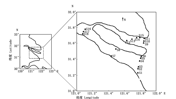 1 材料与方法 1.1 样本的采集和处理依据《海洋监测规范》[22]相关内容,于2010年8月至2010年9月在长江河口口门内水域潮下带开展水环境因子的监测和浮游植物的采样。根据当地的水动力学和泥沙沉积情况等环境特征,共设置7个采样断面18个采样点,主要集中在长江口口门段内的潮下带水域,包括9个南支采样点、6个北支采样点以及3个主河道采样点,采样点具体分布如图 1所示。
