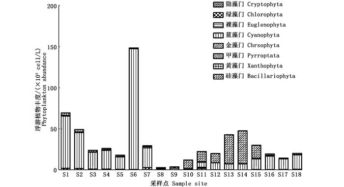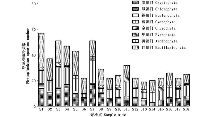 18个采样点采集的浮游植物样品,共鉴定到浮游植物8门,71属,157种。其中:硅藻门种类最多达61种,占总种类数的39%;其次为绿藻门41种,占26%;蓝藻门35种,占22%;裸藻门7种,占4%;甲藻门6种,占4%;黄藻门4种,占3%;金藻门2种,占1%;隐藻门1种,占1%。对各样点的种类数进行统计(图 2),平均物种数为32种,其中:南支水域的S1样点的物种数最多,为57种; 北支水域的S13样点的物种数最少,仅有19种。结果显示南支水域的浮游植物种类数较多,北支水域和主河道水域的种类数相对较少,可达极显著差异(P<0.01)。