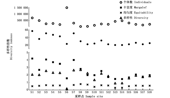 分析Pielou均匀度指数、Margalef丰富度指数和Shannon-Wiener多样性指数结果见图 4。各样点的均匀度指数变化比较平稳,仅在S6样点偏低,达0.06,其余各样点均在0.30~0.79之间波动,S8样点的均匀度最高,达到了0.79;丰富度指数变化较大,在1.45~4.16之间:南支的丰富度指数偏高,平均为3.38,最高点出现在S1样点,为4.16;北支和主河道的丰富度指数较低,分别为1.82和1.93,最低点为S14样点的1.453。Shannon-Wiener多样性指数变化和丰富度指数变化比较一致:南支的多样性指数除S6样点外,整体较高(H′>2),平均为2.15;北支和主河道的多样性指数偏低,平均为1.57和1.84。