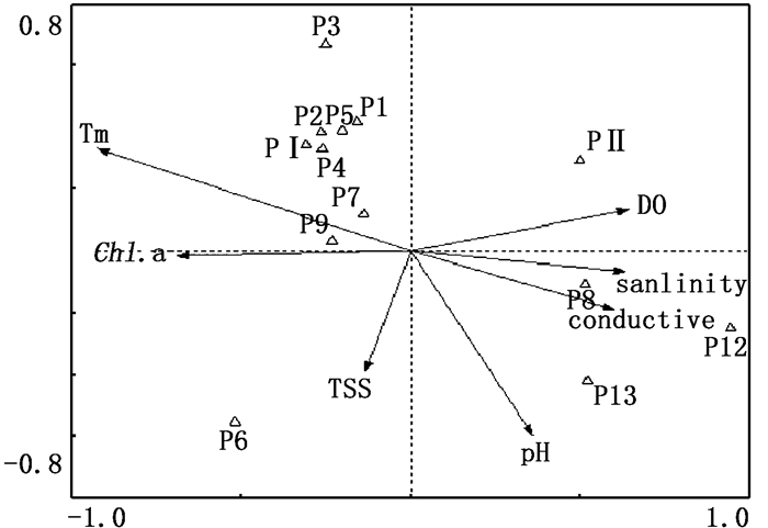 用CCA对13种浮游植物(表 1)和7种环境因子的关系进行分析,前两个排序轴的特征值为0.768和0.481,浮游植物和环境因子相关系数分别为0.970和0.758,说明排序图能够很好地反映物种与环境的关系。前两个排序轴所能解释的浮游植物种类与环境之间关系的解释量为76.4%。对物种与环境因子排序,盐度(r=0.613 7)、电导率(r=0.583 1)、溶氧量(r=0.624 8)与轴1表现出较高的正相关性,温度(r=-0.897 3)、叶绿素a(r=-0.669 2)与轴一表现出较高的负相关性。因此对调查水域浮游植物种类和密度的分布影响较为显著的环境因子为:盐度、电导率、溶氧量、温度和叶绿素a。