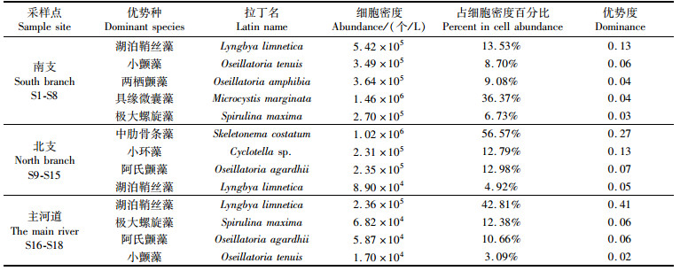 对长江口各取样点的优势种进行分析(表 2),发现南支和主河道水域的优势种都来自蓝藻门,而北支的优势种来自硅藻门。蓝藻门的湖泊鞘丝藻(Lyngbya limnetica)是全年优势种中优势度最高的,常见种为蓝藻门的阿氏颤藻(Oseillatoria agardhii),两栖颤藻(amphibia),小颤藻(Oseillatoria tenuis),绿藻门的小球藻(Chlorella vulgaris),以及硅藻门Oseillatoria的中肋骨条藻(Skeletonema costatum)。