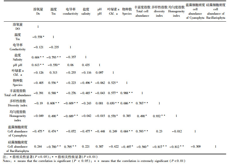 利用PASW Statistics 18.0分析软件对各个样点的溶氧量、温度、电导率、盐度、pH、叶绿素a的六项相关环境因子与物种数、Margalef丰富度指数、多样性指数、均匀度指数、蓝藻细胞密度、硅藻细胞密度共13项进行Pearson相关性分析(表 3),结果如下:物种数和丰富度指数分别与温度、叶绿素a显著正相关,与盐度显著负相关;多样性指数和均匀度指数分别与温度、叶绿素a显著正相关,与电导率显著负相关;蓝藻细胞密度与温度显著正相关,与溶氧量、盐度显著负相关;硅藻细胞密度与电导率显著正相关,与温度显著负相关。