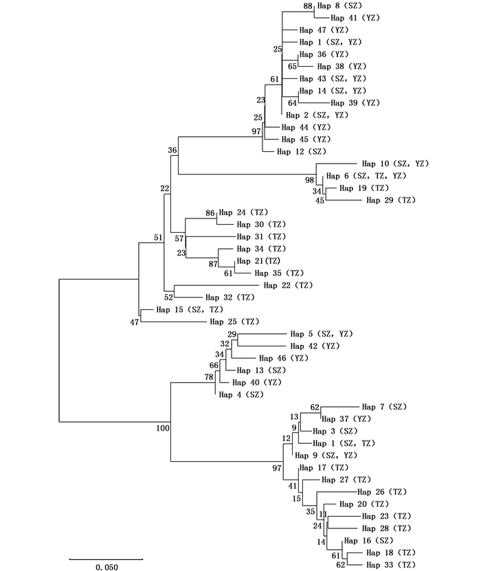 SZ.苏州群体;TZ.泰州群体;YZ.扬州群体 SZ.Suzhou population; TZ.Taizhou population; YZ.Yangzhou population 图 1 宽体金线蛭线粒体Cytb基因单倍型NJ系统树 Fig. 1 Neighbor-Joining tree based on mtDNA Cytb haplotypes of W.pigra |