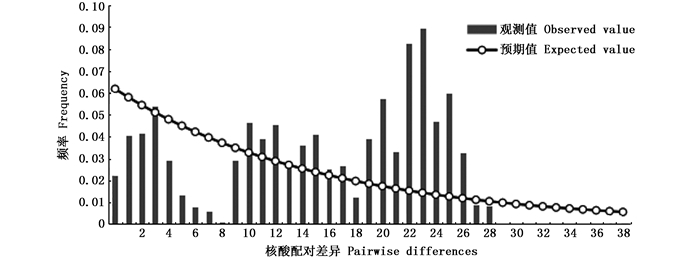 图 2 宽体金线蛭线粒体Cytb单倍型核苷酸不配对分布图 Fig. 2 Mismatch distribution analysis of mtDNA Cytb sequence of W.pigra |