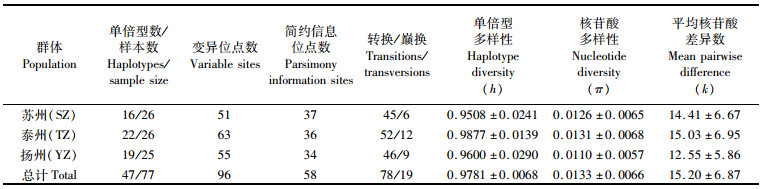 3个群体的总单倍型多样性、总核苷酸多样性、平均核苷酸差异数分别为0.978 1、0.013 3、15.20,其中泰州海陵群体的单倍型多样性(0.987 7)、核苷酸多样性(0.013 1)及平均核苷酸差异数(15.03)均高于其他两个群体,苏州张家港群体的单倍型多样性(0.950 8)最低,扬州高邮群体的核苷酸多样性(0.011 0)及平均核苷酸差异数(12.55)均最低。