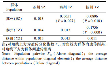 2.3 宽体金线蛭群体遗传结构分析由表 2可知,宽体金线蛭群体间遗传距离为0.013~0.015,其中,泰州海陵群体和扬州高邮群体之间的遗传距离最大(0.015),苏州张家港群体和扬州高邮群体间的遗传距离最小(0.013)。在3个地理群体中,扬州高邮群体的群内遗传距离最小(0.011),苏州张家港和泰州海陵群体的群内遗传距离均为0.013。宽体金线蛭3个群体间的遗传分化指数Fst范围为0.065 1~0.175 6,且差异显著(P < 0.05),说明宽体金线蛭3个地理群体之间均存在遗传分化。其中,泰州海陵群体与扬州高邮群体之间的遗传分化指数最高,为0.175 6,且差异极显著(P < 0.01),表明两群体间遗传分化极为显著。AMOVA分析结果显示,宽体金线蛭群体间和群体内的遗传变异分别占总变异的11.13%和88.87%,且分化指数Fst为0.111 3,差异显著(P < 0.05),说明宽体金线蛭遗传变异主要来自群体内。