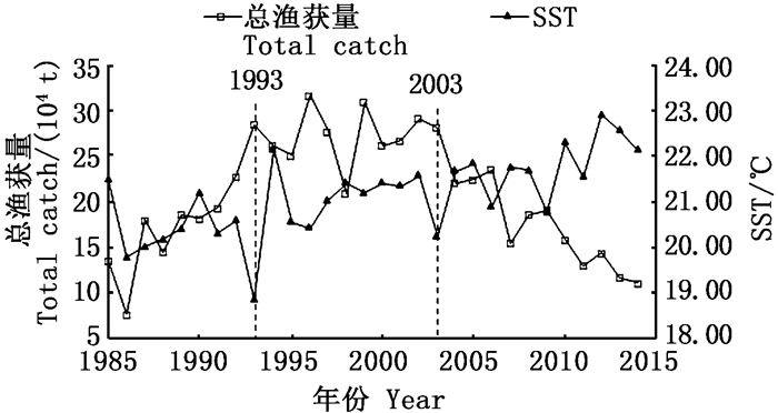 2 结果与分析 2.1 渔获量与平均海表面温度渔获量1985—1993年增长较快;1993—2003年呈波动状态,且起伏较大;2003—2014年下降较快。SST 1985—1993年呈波动下降趋势;1993—2003年整体呈波动状态,且尤以1993—1995、2002—2003年起伏较大;2003—2014年呈波动上升趋势。
