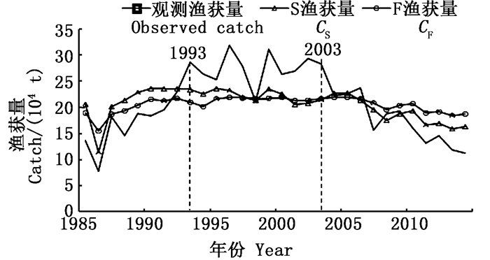 式中:C-S为t年Schaefer模型求得的渔获量预测值;C-F为t年Fox模型的渔获量预测值。
