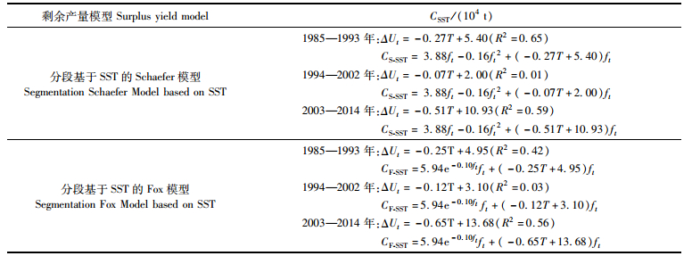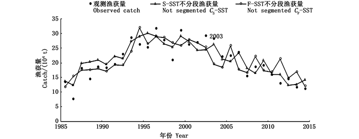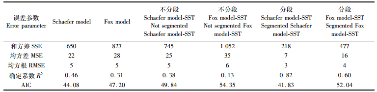 拟合效果为分段Schaefer model-SST最好。不基于AIC的分析结果表明拟合效果依次是分段Foxmodel-SST、Schaefer model、不分段Schaefer model-SST、Fox model,最后是不分段的Foxmodel-SST;基于AIC的分析结果表明拟合效果随参数增多而变差,无论参数变量为多少,Schaefer模型的拟合效果均好于Fox模型的拟合效果。见表 5。
