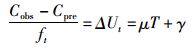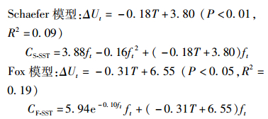 1.3 基于环境因子的剩余产量模型假设渔获量观测值与预测值之间的差值与捕捞努力量的比值ΔU(CPUE残差)是由SST引起[19]且呈线性关系,则: