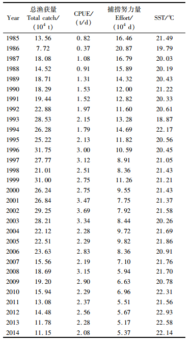 1 材料与方法 1.1 数据选择渔业数据来自日本海海洋渔业研究所《平成29(2017)年太平洋褶柔鱼秋生群落资源评估报告》,包括:1985—2014年的总渔获量、捕捞努力量及CPUE[8](表 1)。捕捞时间为5—9月。