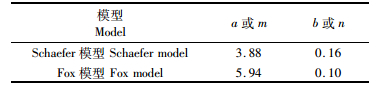 经回归计算,得Schaefer模型(P<0.01,R2=0.59)和Fox模型(P<0.01,R2=0.68)的参数见表 3。
