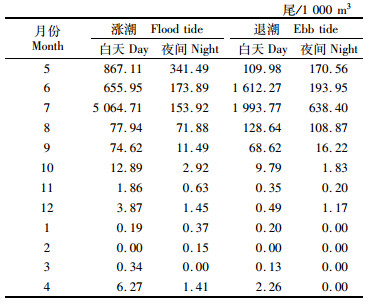 采集到的仔稚鱼随潮汐变化趋势:涨潮时, 5—6月有所下降, 6—7月显著上升, 7—8月显著下降, 从9月开始渔获密度逐渐降低, 在同年12月至次年4月达到最低; 退潮时, 渔获密度在5—7月逐月上升, 7—8月显著下降, 从9月开始渔获密度逐渐降低, 在同年12月至次年4月达到最低。全年仔稚鱼渔获主要集中在5—9月, 其中7月渔获量最多(29 605尾), 其涨潮、退潮时的平均密度均为全年最高, 分别为2 609.3尾/1 000 m3、1 316.1尾/1 000 m3。2月涨潮及1—3月退潮时平均密度最低, 均为0.1尾/1 000 m3。从整体变化来看, 涨潮时的平均密度总体高于退潮时。见图 2。