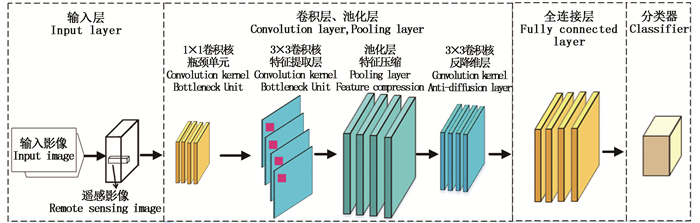 1 改进的深度卷积神经网络图 1所示为改进的卷积神经网络架构图,包括1个输入层、3个卷积层、1个池化层、多个全连接与分类器。3个卷积层分别为:第1个卷积层为降维层,为提高计算效率增设1×1的卷积核作为瓶颈单元,通过卷积运算对遥感影像进行降维;第2个卷积层为特征提取层,由多个3×3的卷积核构成,用于提取遥感影像的局部空间或纹理特征;第3个卷积层为反降维层,由3个3×3的卷积核构成,将特征提取后的遥感影像反降维。池化层与第2个卷积层(即特征提取层)相伴而生,用于对卷积核运算提取的特征进行压缩。而后通过全连接层对提取的特征影像拉伸成一维矢量并映射到样本空间,再通过分类器对遥感影像进行分类。