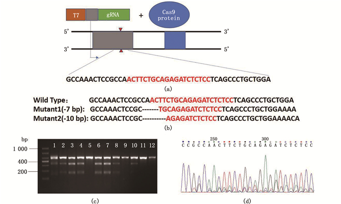 根据靶点位置设计PCR检测引物,检测引物设计还需满足:上下游引物与靶点之间的距离大于100 bp,并且上游引物到靶点的距离和下游引物到靶点的距离之间的差大于100 bp,便于后续电泳检测。sst1检测引物扩增片段为480 bp,PCR扩增为单一条带,引物序列见表 1。