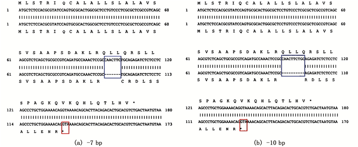 “*”代表终止密码子;蓝色方框代表与野生型相比,突变体缺失碱基;红色方框代表终止密码子。 "*" represents a termination codon; Blue box represents the deletion of the base compared with the wild type; Red box represents the termination codon. 图 2 野生型和sst1-/- 突变体氨基酸比对 Fig. 2 Amino acid comparison between the wild-type and sst1-/- mutant |