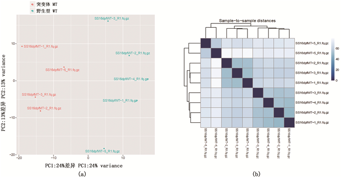 (a)野生型和sst1-/-突变体转录组主成分分析,两组间沿PC1分离;(b)野生型和sst1-/-突变体样本间相关性,颜色越深表明样本间的相关性越高。 (a) Principal components analysis of transcriptome samples from wild-type and sst1-/- mutant showing separation between the two groups along PC1; (b) Correlation of distances between wild-type and sst1-/- mutant samples, and a darker colour indicates a higher correlation between samples. 图 3 测序数据总结 Fig. 3 Summary of sequencing data processing |