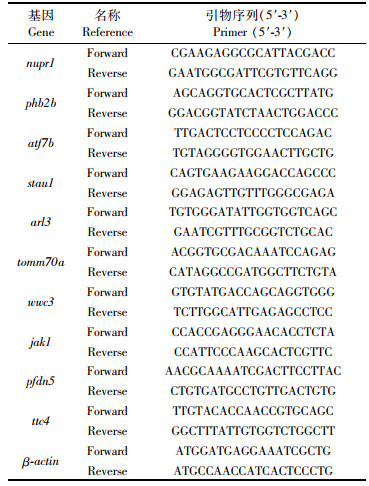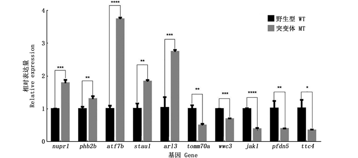 2.6 荧光定量PCR(RT-qPCR)验证为验证转录组结果,分别随机选取5个显著上调和下调的差异表达基因进行RT-qPCR验证。RT-qPCR验证结果(图 6)显示,与野生型相比,突变体中nupr1、phb2b、atf7b、stau1、arl3基因mRNA表达水平上调,tomm70a、wwc3、jak1、pfdn5、ttc4基因mRNA表达水平下调,其变化趋势与转录组测序分析结果一致。