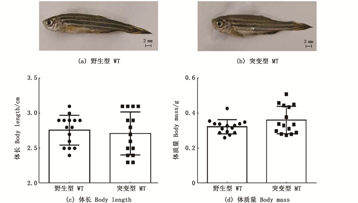 转录组结果表明,与野生型相比,突变体中发现了两个显著下调的igf(insulin like growth factor,igf)结合蛋白差异表达基因igfbp1a和igfbp5a。igf是调节鱼类生长的关键因子,因此对6月龄野生型和突变体体质量及体长进行分析,结果发现,与野生型相比,突变体体长略微降低,体质量略微升高,但均无显著性差异(图 7)。