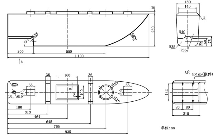 图 1 虾蟹塘投饵船单船体尺寸示意图 Fig. 1 Schematic diagram of single hull size of shrimp and crab pond feeding boat |