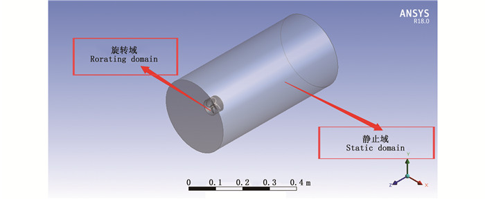 2.2 网格划分与边界条件网格划分的质量与边界条件的清晰设定将直接影响控制方程离散的精度和速度导致最终仿真计算结果的精确程度。仿真试验中,静止域长度设置为螺旋桨直径的20倍,直径为螺旋桨直径的5倍,旋转域设置在静止域内部尺寸且略大于螺旋桨直径,如图 3所示。在旋转域与静止域的边界场建立交界面,给予旋转域一定的角速度使其相对于静止域绕螺旋桨旋转轴匀速旋转运动和自由运动来模拟实际工作情况。在螺旋桨周围旋转域以及静止域周围设置网格加密区,利用Mesh模块对所建仿真模型采用六面体网格划分,为提高数值模拟的精确性、准确性和稳定性,对静止域、旋转域及螺旋桨进行网格加密处理,网格的总数达到6 173 129个,单元节点为1 068 896个。有研究[29]指出:当网格尺度低于螺旋桨直径的1.76%时,其水动力性能和尾涡模拟具有较高可靠性,因此,选择静止域加密区的网格尺度为5×10-4 m,对应螺旋桨旋转域加密区的网格尺度设置为5×10-4 m,均在1.76%之内。
