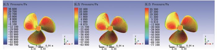 为了分析3种不同直径螺旋桨在模拟虾蟹塘工况下进行工作的水动力性能,利用控制变量法,改变旋转域转速以及螺旋桨的直径参数来判断螺旋桨叶片截面压力与平均轴向射流速度之间的关系。旋转域设置的转速分别为n1=3 000 r/min、n2=3 500 r/min和n3=4 000 r/min。各种不同直径螺旋桨在各转速下的叶片截面压力云图,以0.07 m直径螺旋桨为例,其云图如图 4所示。