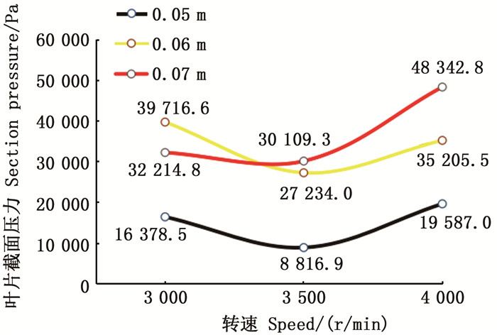 根据表 4中的数据,螺旋桨叶片截面压力的最大值在3 500 r/min时最小,且都在n2=3 500 r/min时,最大叶片截面压力为最小值,而叶片截面压力的最小值为先增加再减少,说明在n2=3 500 r/min时,叶片截面压力的差值变化为最小。根据图 5所示螺旋桨叶片截面压力差值变化曲线,当n2=3 500 r/min时,其截面正压力与截面负压力的差为最小。