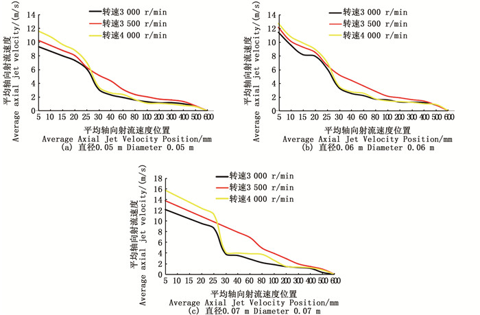 为深入研究螺旋桨实际工作射流速度与平均轴向射流速度的关系,经仿真计算分析,各直径螺旋桨的平均轴向射流速度与平均轴向射流速度位置的关系曲线如图 7所示,螺旋桨的平均轴向射流速度随平均轴向射流速度位置越远而越少,其中在20~30 mm处,都有较为明显的速度衰减。而转速在n2=3 500 r/min时,各螺旋桨的平均轴向射流速度衰减都较为平缓,这也验证在该转速下,螺旋桨的敞水性能以及工作效率为最优。