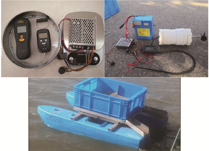 为了进一步分析虾蟹塘投饵船螺旋桨的能耗特性及验证仿真分析方法的可行性,根据本文CFD水动力仿真试验结论,将螺旋桨模型保存为二进制模型,通过将所设计螺旋桨模型导入Sprint-3D进行3D打印,获得螺旋桨实物,进行螺旋桨实物现场试验。试验于2019年12月10日在上海市奉贤区四团镇虾蟹塘合作养殖基地进行,如图 9所示,试验设备见表 6。