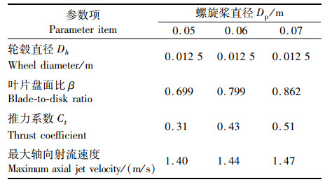 根据STEWART等[25]研究表明螺旋桨最大轴向射流速度只有在x/Dp=0.35以内有效,超过该距离后,轴向射流速度沿着螺旋桨射流轴线将呈现逐渐衰减状态,直到x/Dp=3.25衰减结束。根据螺旋桨最大轴向射流速度的有效性,将x/Dp=0.35以及上述所得各螺旋桨叶片盘面比代入公式3,可得螺旋桨直径Dp=0.07 m最大轴向射流速度Vmax=1.48 m/s。同理直径为0.05 m以及0.06 m螺旋桨在转速n=58 r/s时其射流发展区最大轴向射流速度分别为1.41和1.46 m/s。