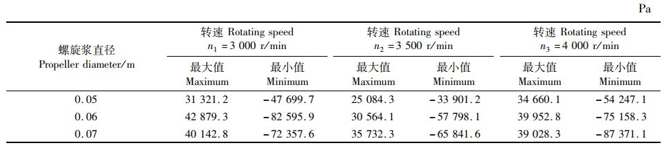 表 4 不同转速下各直径螺旋桨仿真截面压力最值 Tab.4 Maximum and minimum pressures of simulated section of propellers of each diameter at different rotating speeds |