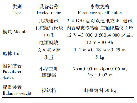 近年来,我国在自动化虾蟹塘投饵船设备的探索和推广上开展了一系列的工作。综合国内文献,虾蟹塘投饵船推进装置主要分两种方式。第一种是使用明轮作为推进装置,胡庆松等[2]和程志金[3]研究设计了一种基于明轮驱动虾塘自主导航投饵船,平均船速达0.72 m/s,具有良好的抗风性,但工作效率仅为31.79%。第二种是使用螺旋桨作为推进装置,孙月平等[4]研究设计了一种空气螺旋桨风力驱动投饵船,试验表明投饵船具有良好的稳定性,但平均船速只有0.42 m/s,效率损耗较大。胡庆松等[5]研究设计了一种直径为0.1 m的三叶小型螺旋桨作为推进装置,其螺旋桨工作状态为浸没式,试验表明空载投饵船船速能够达到1.2 m/s,满载时可达1.02 m/s,并通过研究使用螺旋桨推进虾蟹塘投饵船的饵料负载试验表明,当平均船速达到1 m/s时,投饵船的工作效率较人工精细化管理养殖效率提高50%。因此相比于低船速、高能耗以及低效率的明轮以及半潜式水上风力螺旋桨作为推进装置,水下螺旋桨显然拥有更好的研究价值。