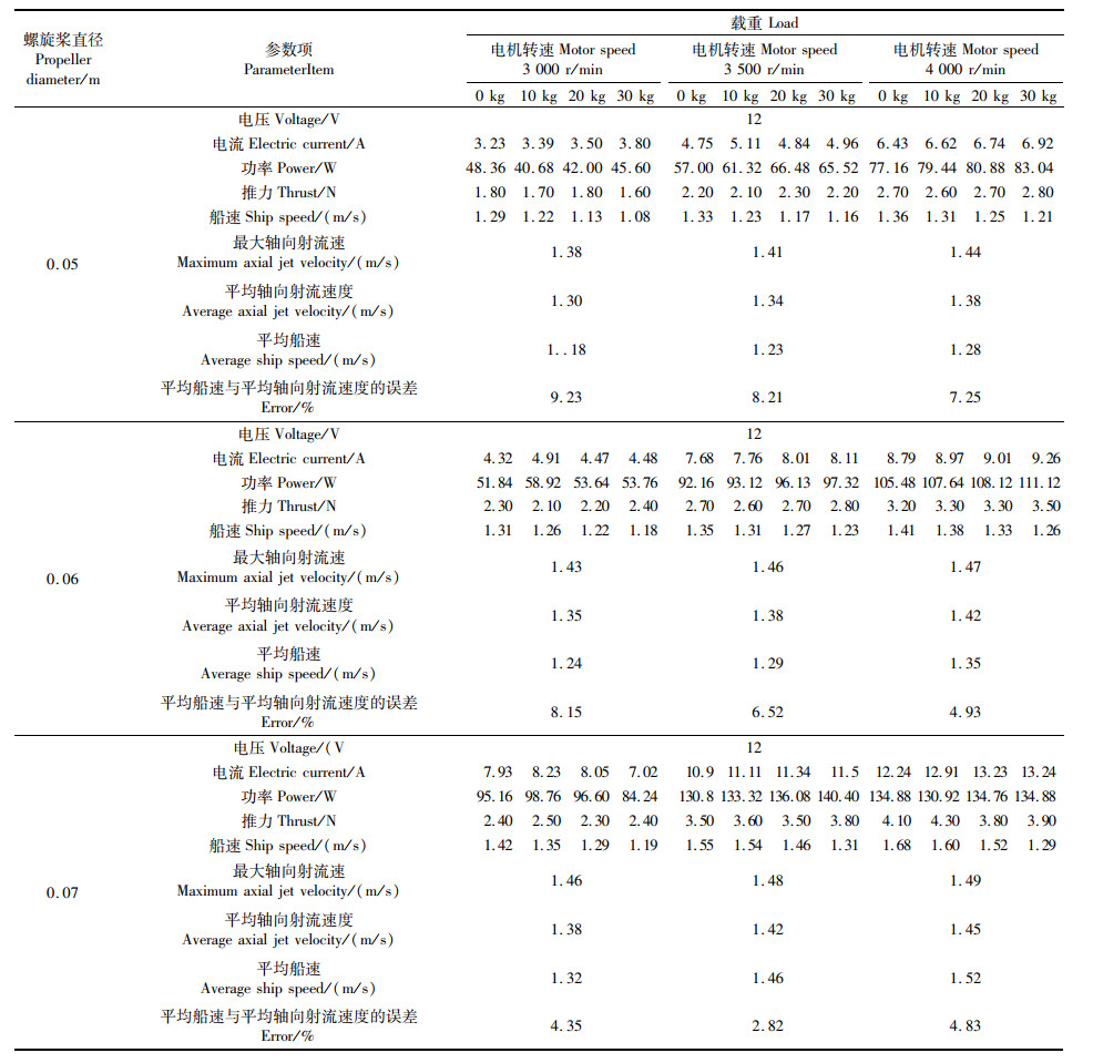 表 7中各工况下的平均船速与平均轴向射流速度的误差均在10%之内,船体负载的影响对于消耗的电流来说没有太大的浮动变化,整体功率趋势呈现平缓状态。但是负载影响船速,负载越重,船体行驶的速度会变得越慢。针对于虾蟹塘投饵船特殊工况来看,由于刚开始投饵工作时船体为满载状态,此时应满足相对较高的船速来保证精确投饵的整体效率。