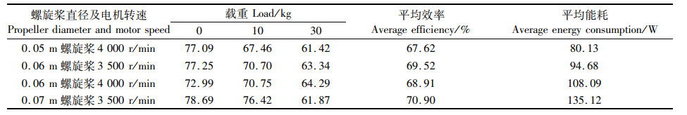 试验过程:分空载和满载两种情况测试螺旋桨搭载船体时的船速以及电能功耗。将虾蟹塘投饵船设定4个GPS定点坐标,选择自主导航模式工作,测试区间为50 m,利用船头搭载的传感器与岸边传感器对接,实现类光电门测速。同时为保证试验数据的准确性,所测电流、船速等数据都在船体相对匀速的行驶状态下测量且均为3次测量的平均值。功率大小测试,以不同螺旋桨配合不同电机,并针对实际虾蟹塘投饵船工作情况,在试验中添加不同载重,并测量其船速以及具有载重的功率消耗。现场试验结果见表 7。