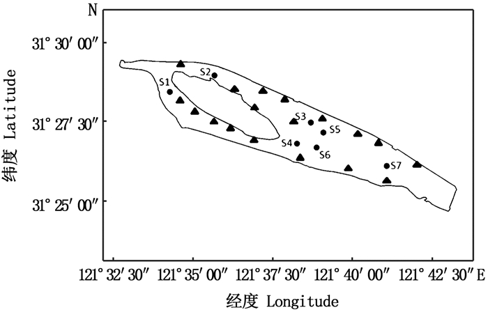 ●刺网采样点S1-S7;▲地笼网采样点。 ●sampling sites s1-s7 of gillnet; ▲sampling sites of cage. 图 1 青草沙水库调查站点示意图 Fig. 1 Sampling sites of Qingcaosha reservoir |