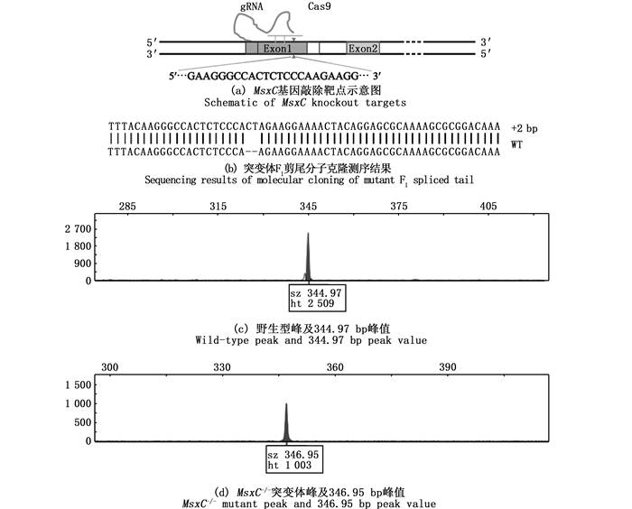 2 结果 2.1 利用CRISPR/Cas9成功构建斑马鱼MsxC基因突变品系sgRNA的靶点位于MsxC基因的第一个外显子(Exon1)上[图 1(a)]。通过靶点上下游设计1对检测引物(MsxC-F和MsxC-R),扩增片段长度324 bp。毛细管电泳检测发现,注射组的PCR产物出现多个峰值,对照胚胎的PCR产物仅有1个较强的约345 bp野生型峰值。