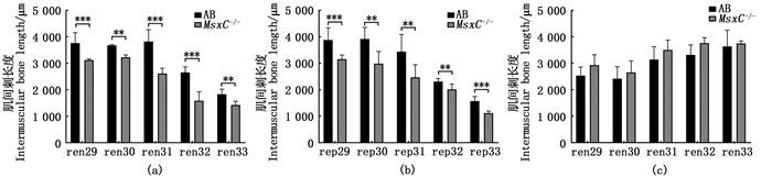 (a)第29~33肌节髓弓小骨长度比较;(b)第29~33肌节脉弓小骨长度比较;(c)第6~10肌节髓弓小骨长度比较;**P < 0.01,***P < 0.001。 (a) Comparisons of the lengths of epineurals between the 29th and 33th sarcomeres; (b) Comparisons of the lengths of epipleurals between the 29th and 33th sarcomeres; (c) Comparisons of the lengths of epineurals between the 6th and 10th sarcomeres; **P < 0.01, ***P < 0.001. 图 2 MsxC-/-和野生型斑马鱼肌间刺长度比较 Fig. 2 Comparison of the lengths of intermuscular bones between MsxC-/- and wild-type zebrafish |