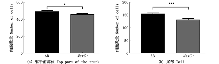 (a)躯干靠前部位相同面积白肌细胞数量对比;(b)尾部相同面积白肌细胞数量对比;*P < 0.05,***P < 0.001。 (a) Comparison of fast muscle cells counts in identical area in the top part of trunk; (b) Comparison of fast muscle cells counts in identical area in the tail part. *P < 0.05, ***P < 0.001. 图 3 MsxC-/-和野生型斑马鱼白肌细胞数量比较 Fig. 3 Comparison of the number of white muscle cells between MsxC-/- and wild-type zebrafish |