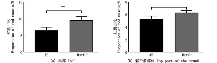 (a)尾部F59抗体红肌标记面积对比;(b)躯干靠前部位F59抗体红肌标记面积对比;**P < 0.01。 (a) Comparison of F59 antibody slow muscle labeled area in the tail; (b) Comparison of F59 antibody slow muscle labeled area in the top part of the trunk; **P < 0.01. 图 4 MsxC-/-和野生型斑马鱼红肌面积比较 Fig. 4 Comparison of red muscle area between MsxC-/- and wild-type zebrafish |